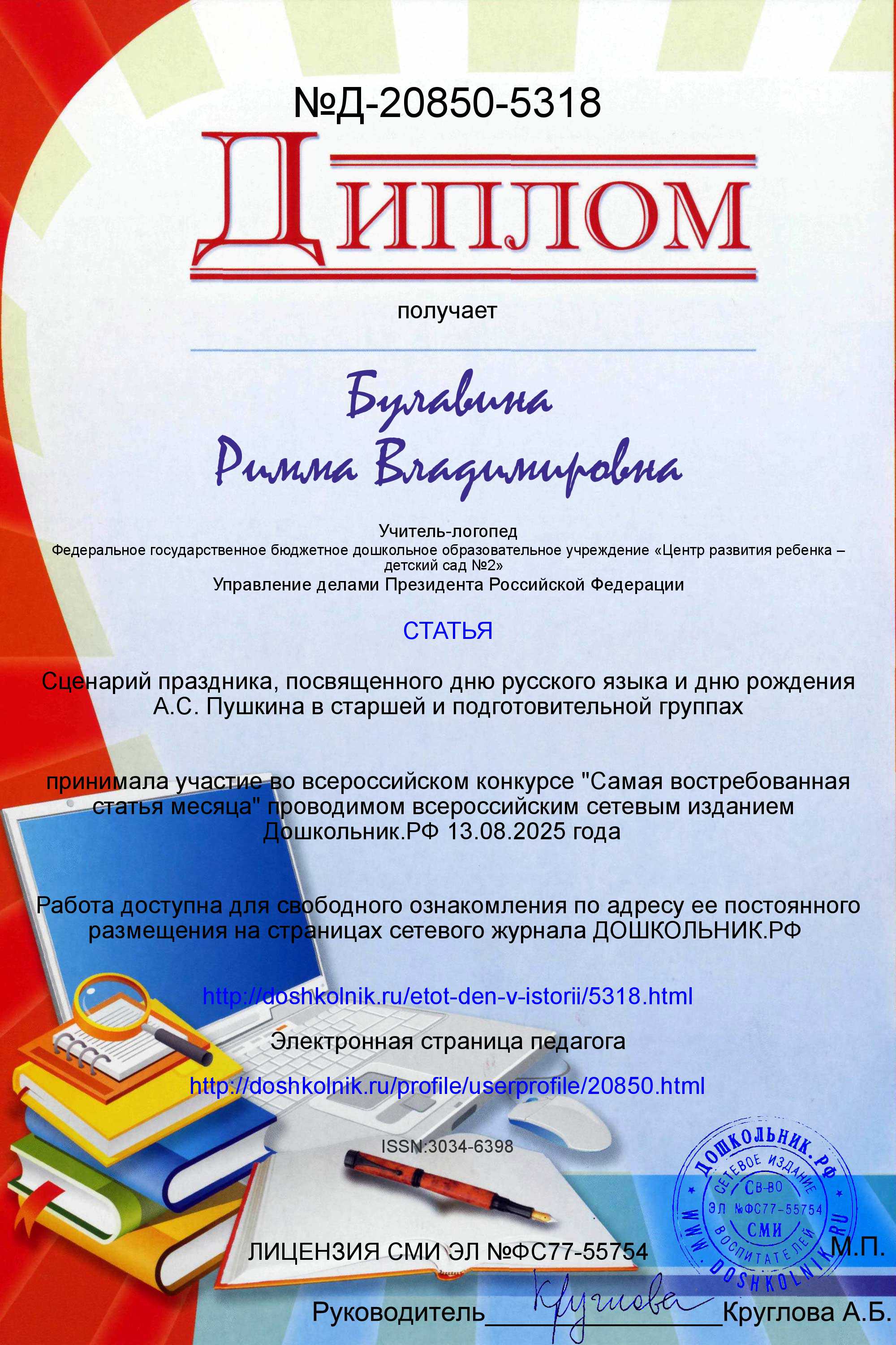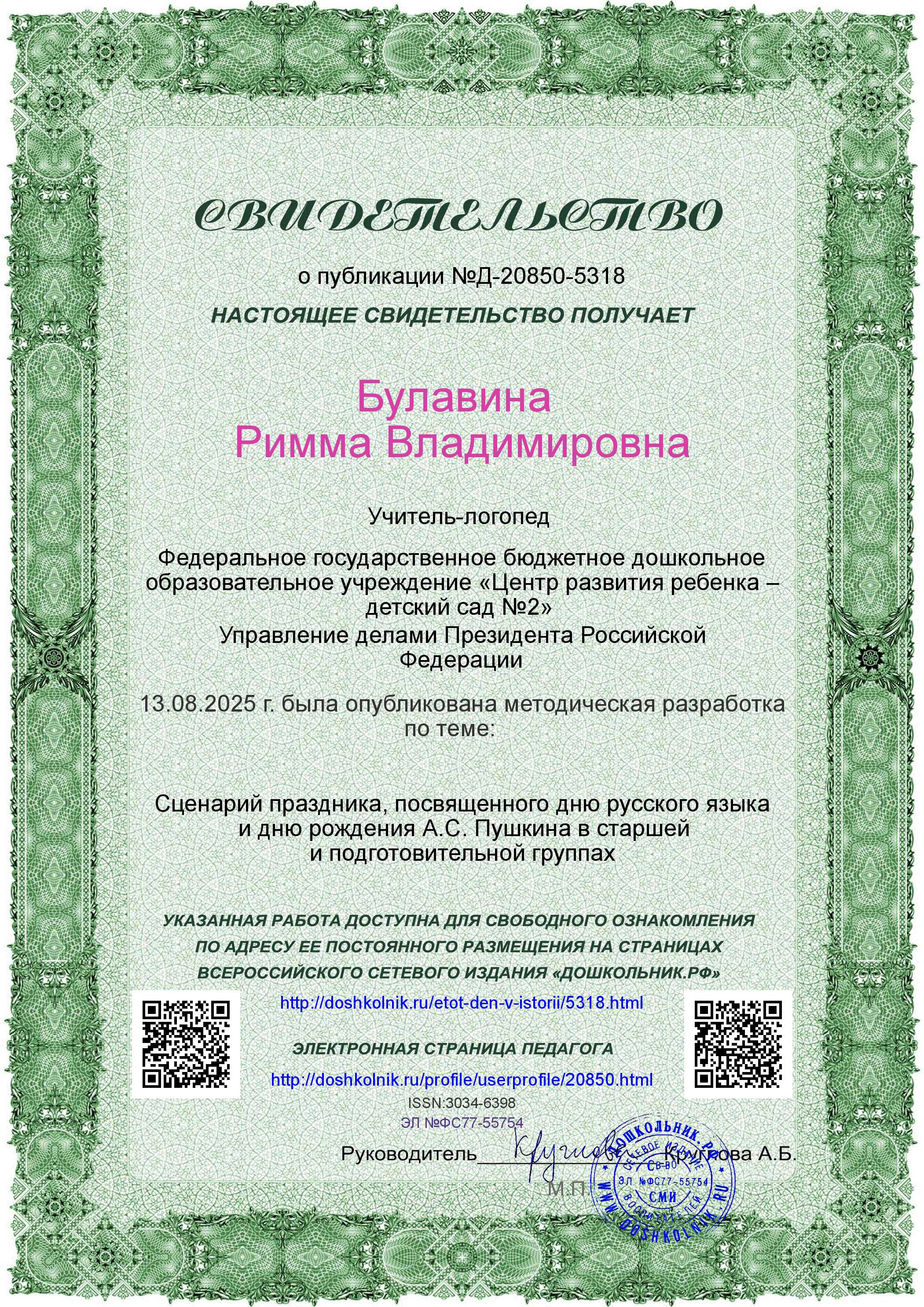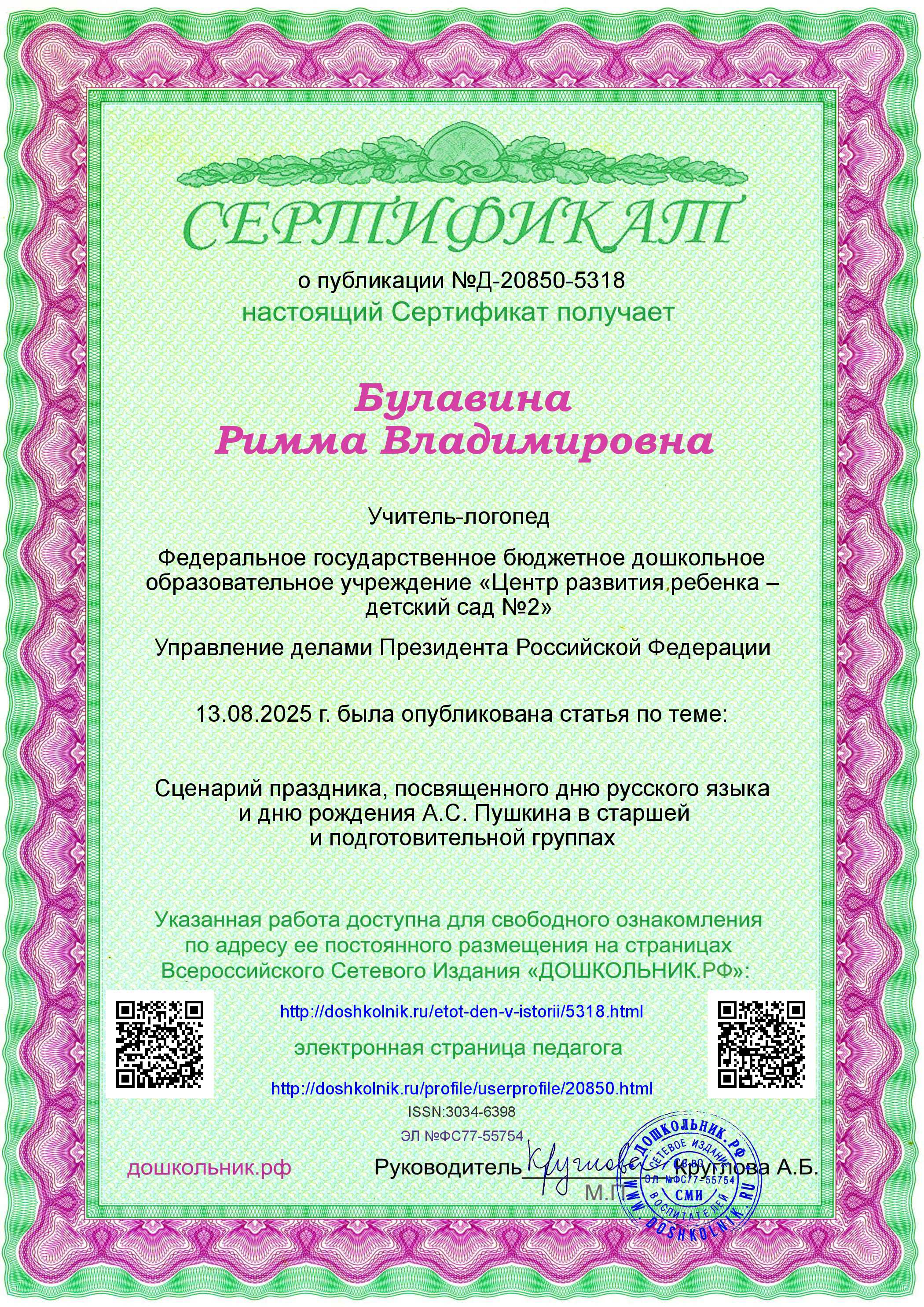Сертификат о публикации в журнале "Дошкольник" в №30 (392) за август 2025г. работы по теме: "Сценарий праздника,посвященного дню русского языка и дню рождения А.С.Пушкина в старшей и подготовительной группах".