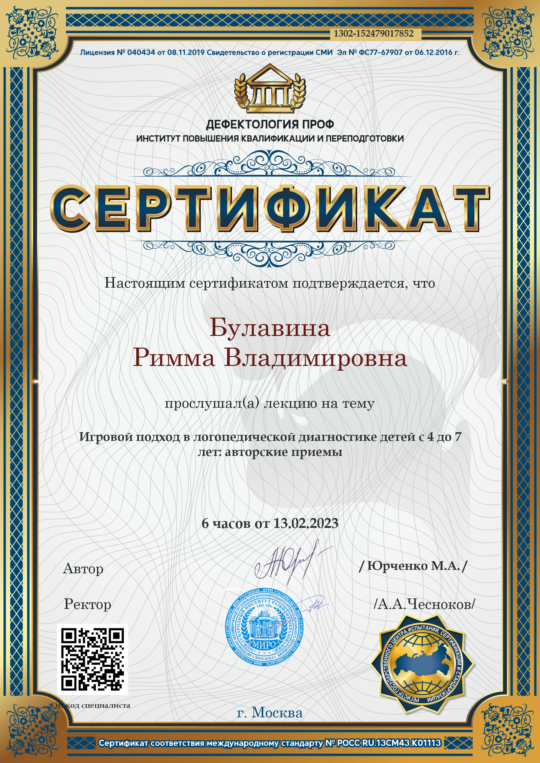 Сертификат слушателя лекции по теме: "Игровой подход в логопедической диагностике детей с 4 до 7 лет: авторские приемы" (6 часов) 13.02.2023.