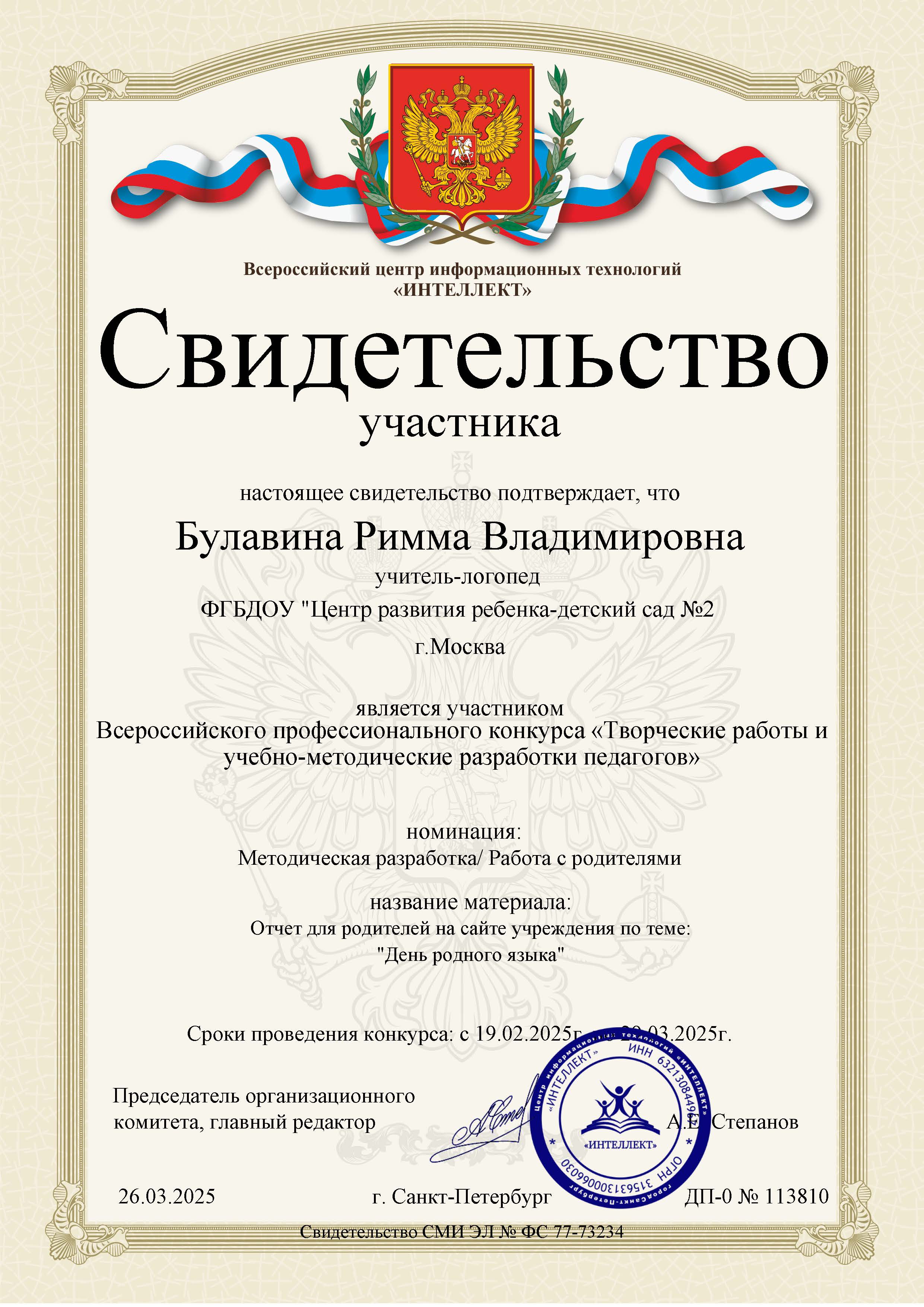 Свидетельство участника Всероссийского профессионального конкурса "Творческие работы и учебно-методические разработки педагогов". Номинация: Работа с родителями. Название материала: Отчет для родителей на сайте по теме: "День родного языка". 26.03.2025.