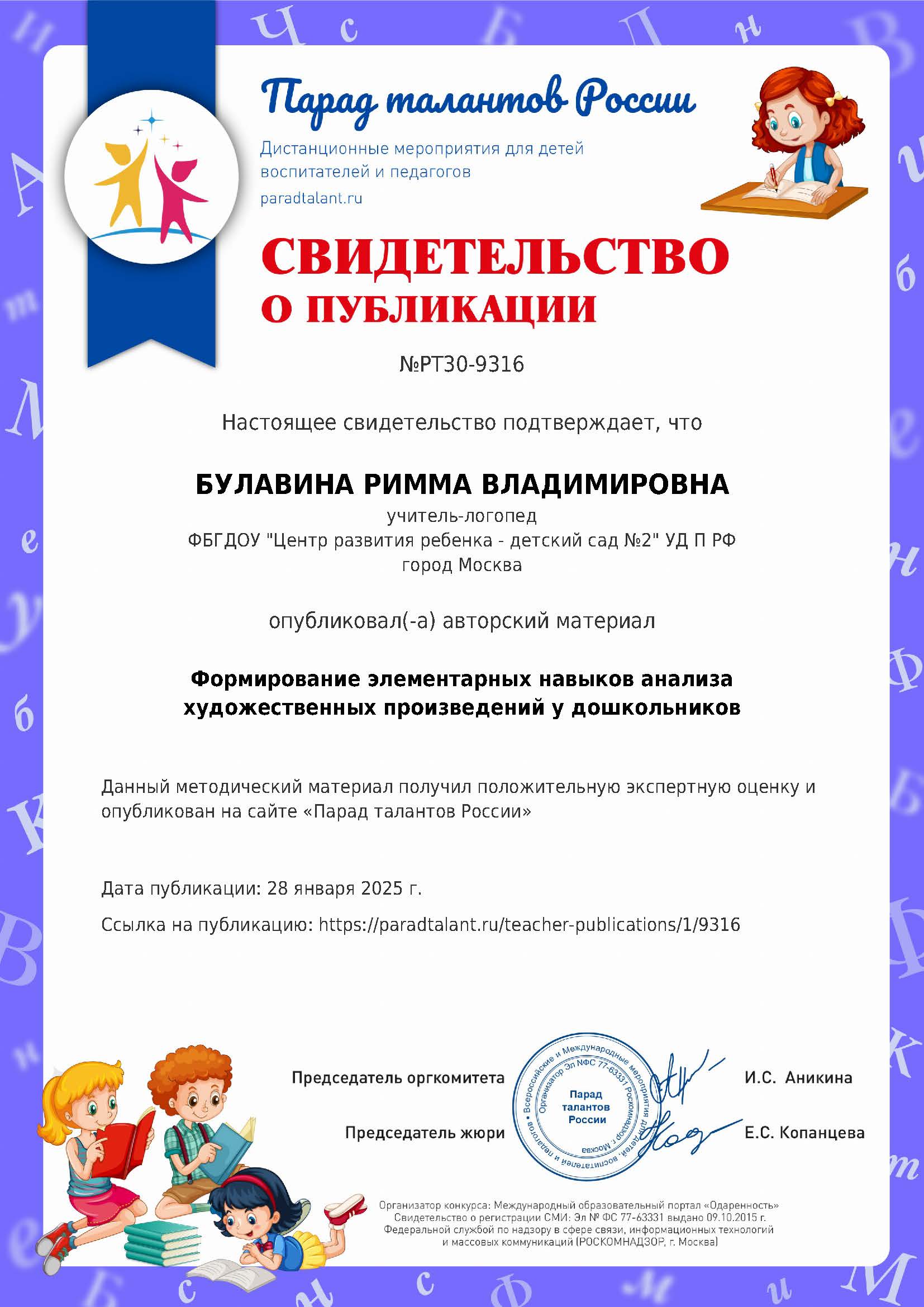Свидетельство о публикации материала: "Формирование элементарных навыков анализа художественного произведения у дошкольников" 28.01.2025.