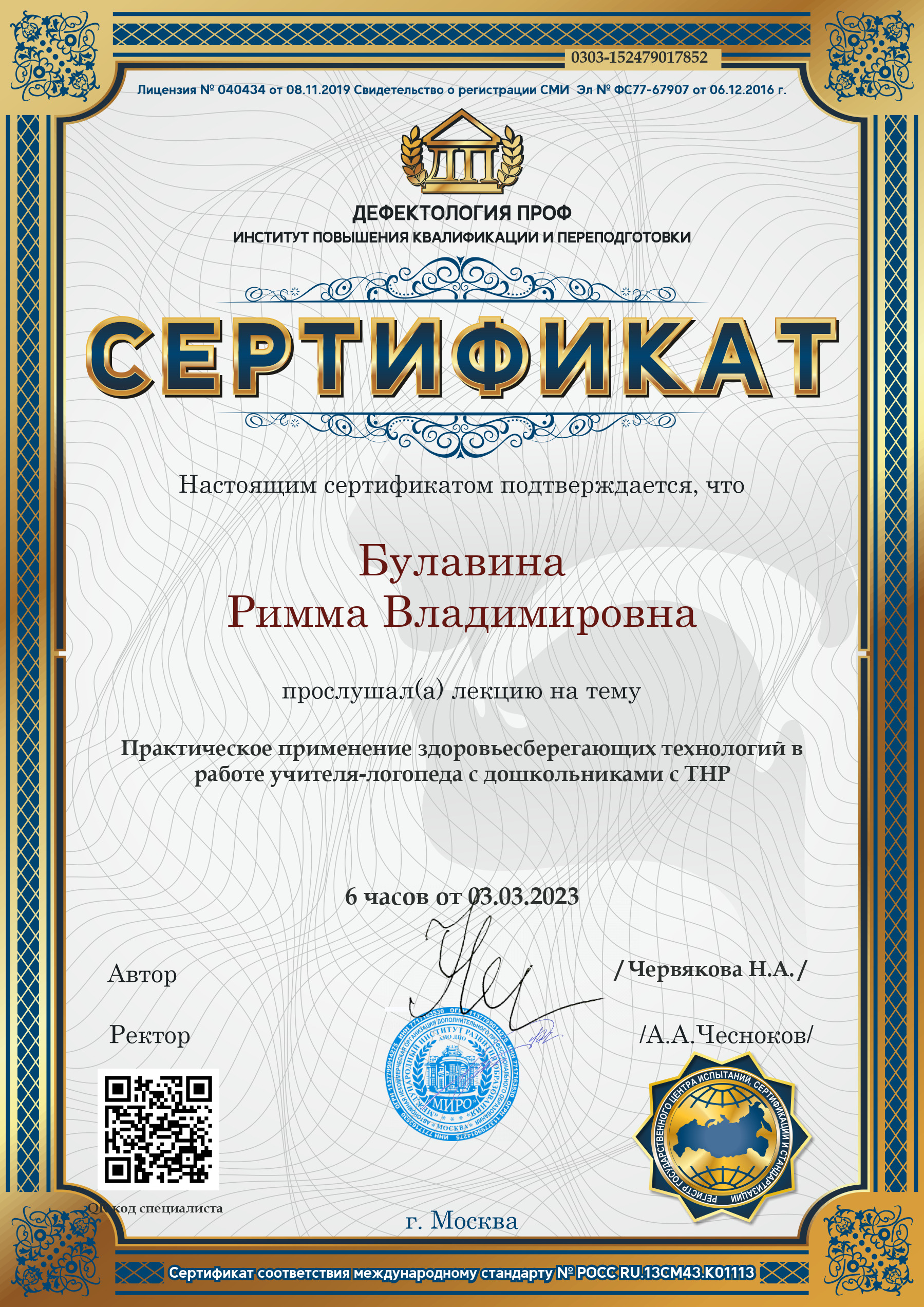 Сертификат участника лекции по теме: "Практическое применение здоровьесберегающих технологий в работе учителя-логопеда с дошкольниками с ТНР" (6 часов) 03.03.2023.