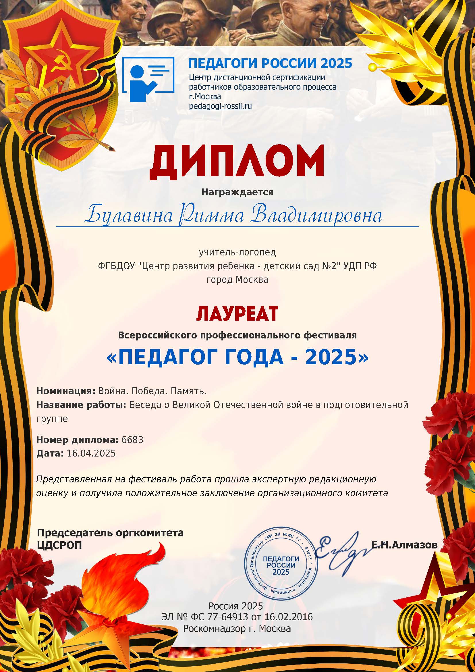 Диплом лауреата Всероссийского проф. фестиваля "Педагог года - 2025". Номинация: Война. Победа. Память. Название работы: Беседа о Великой Отечественной войне в подготовительной группе. 16.02.2025.