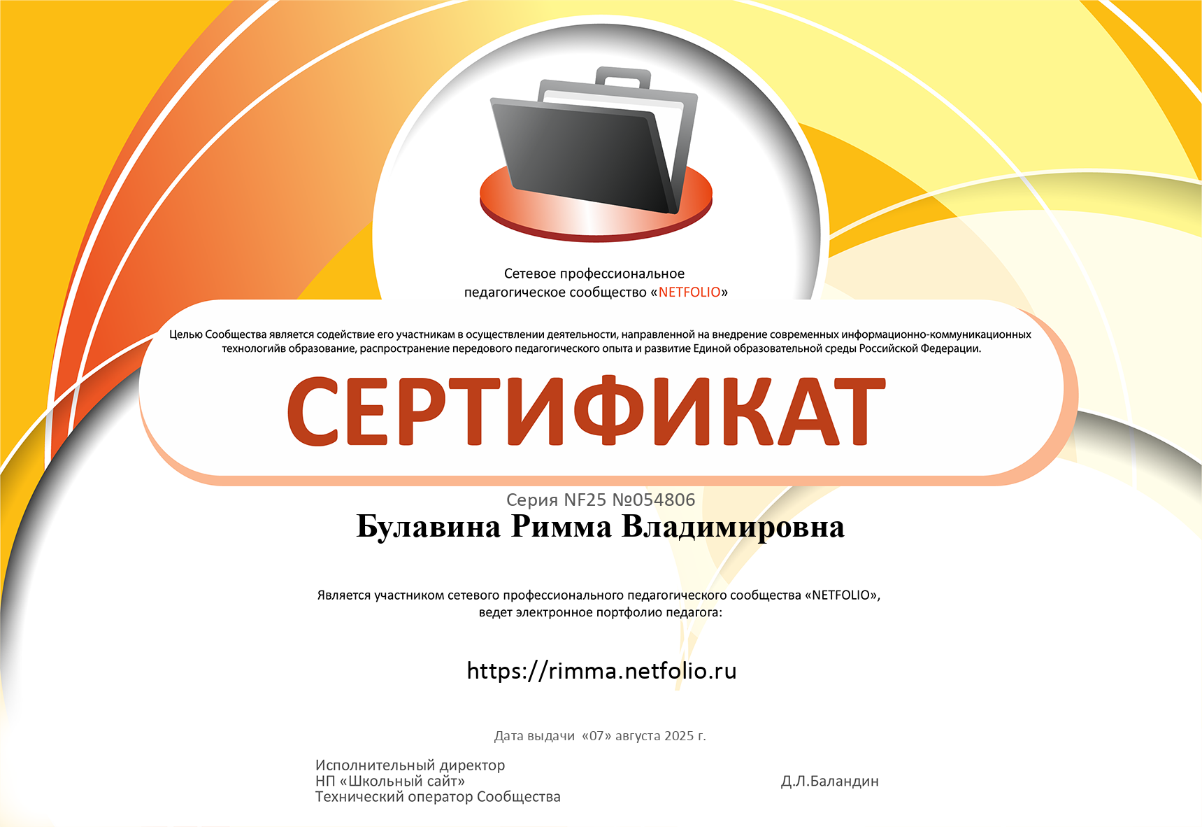 Сертификат участника сетевого профессионального педагогического сообщества "NETFOLIO"