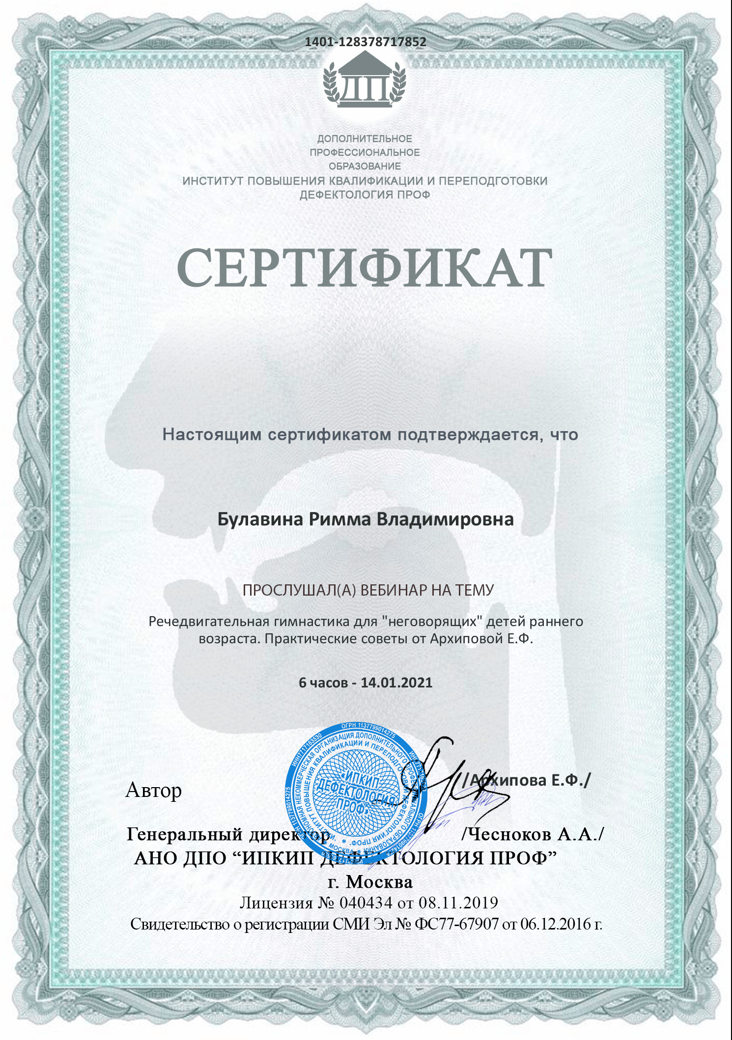 Сертификат участника вебинара на тему:"Речедвигательная гимнастика для "неговорящих" детей раннего возраста. Практические советы от Архиповой Е.Ф. (6часов) 14.01.2021.