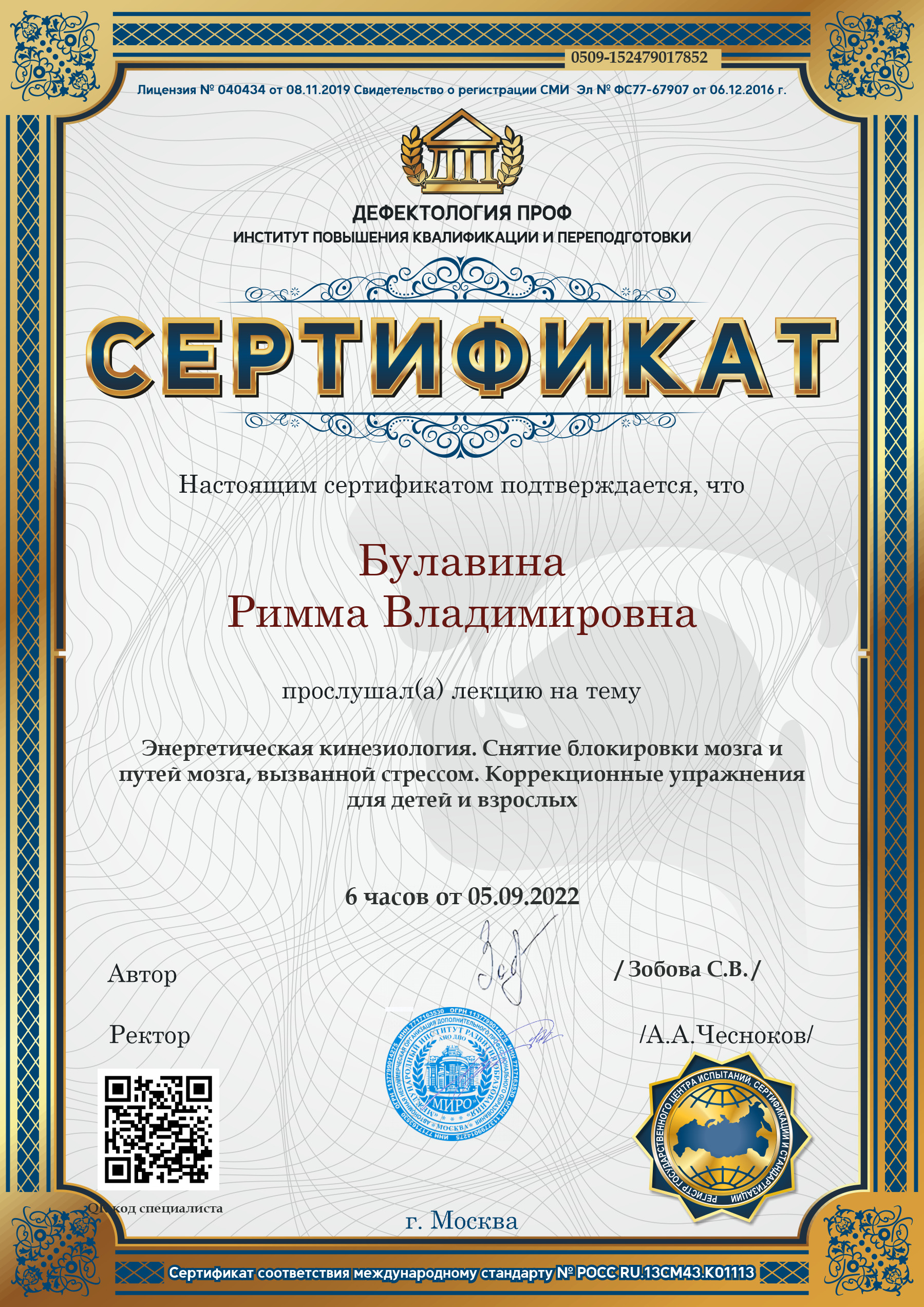 Сертификат участника лекции на тему: "Энергетическая кинезиология. Коррекционные упражнения для детей и взрослых" (6 часов) 05.09.2022.