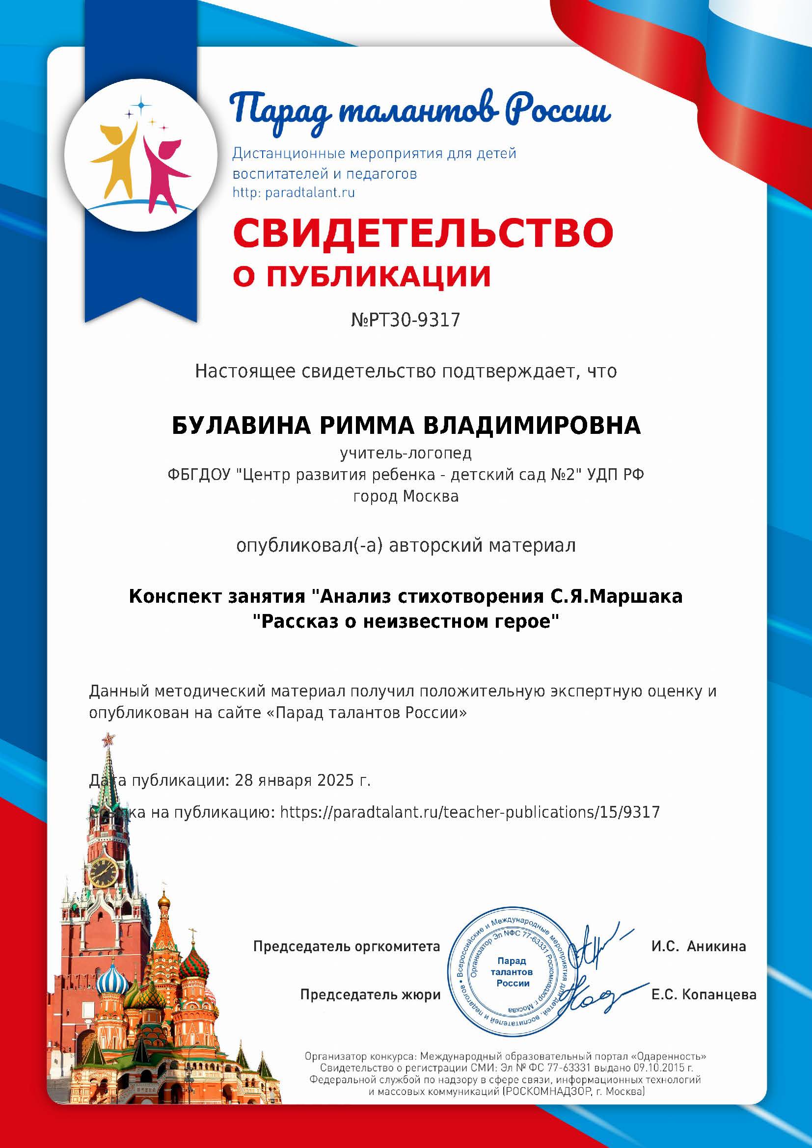 Свидетельство о публикации авторского материала: конспект занятия "Анализ стихотворения С.Я.Маршака "Рассказ о неизвестном герое". 28.01.2025.