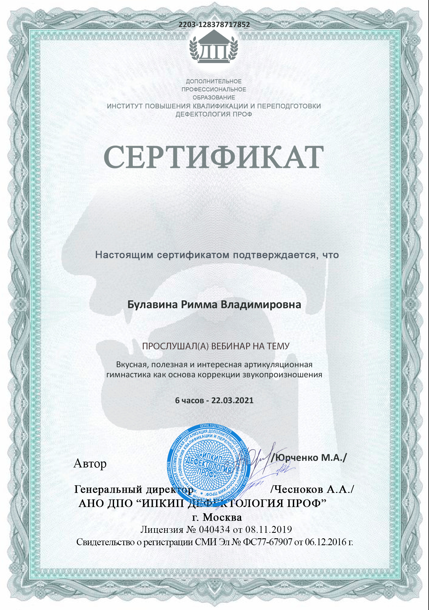 Сертификат участника вебинара на тему: "Вкусная, полезная и интересная артикуляционная гимнастика как основа коррекции звукопроизношения" (6 часов) 22.03.2021.