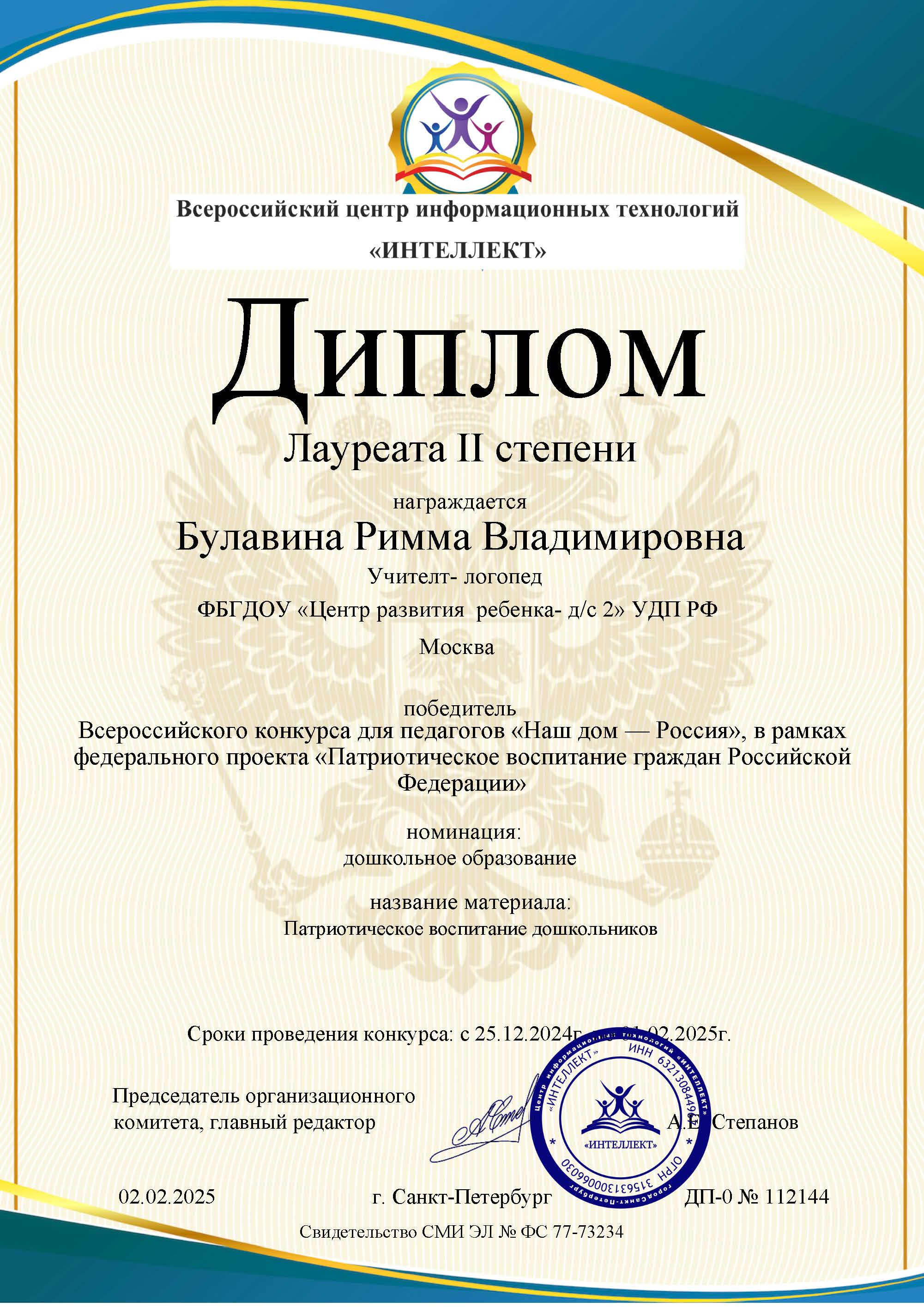 Диплом лауреата II степени Победитель Всероссийского конкурса для педагогов "Наш дом - Россия", в рамках федерального проекта "Патриотическое воспитание граждан РФ". Номинация: дошкольное образование.Название материала: Патриотическое воспитание дошкольников. 01.02.2025.