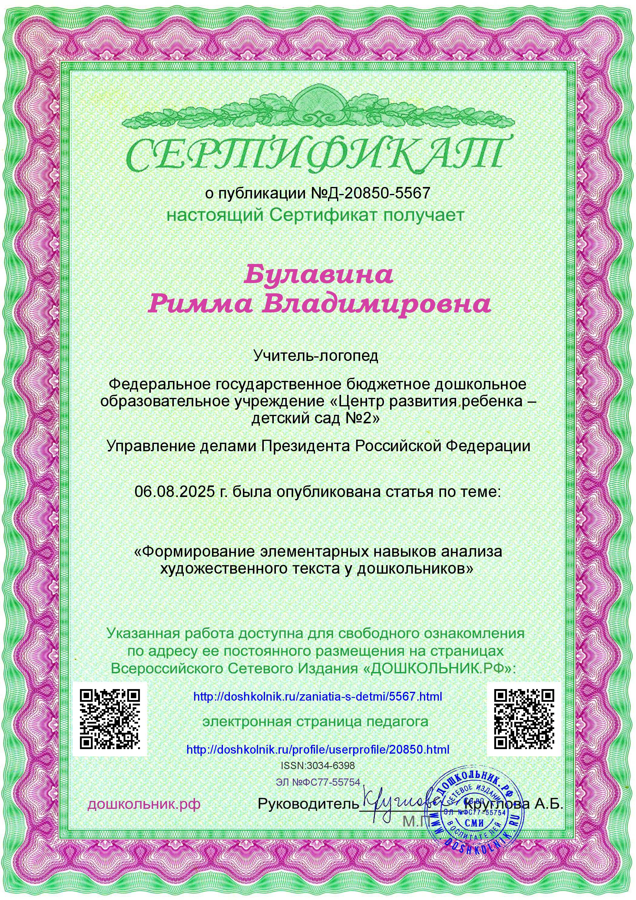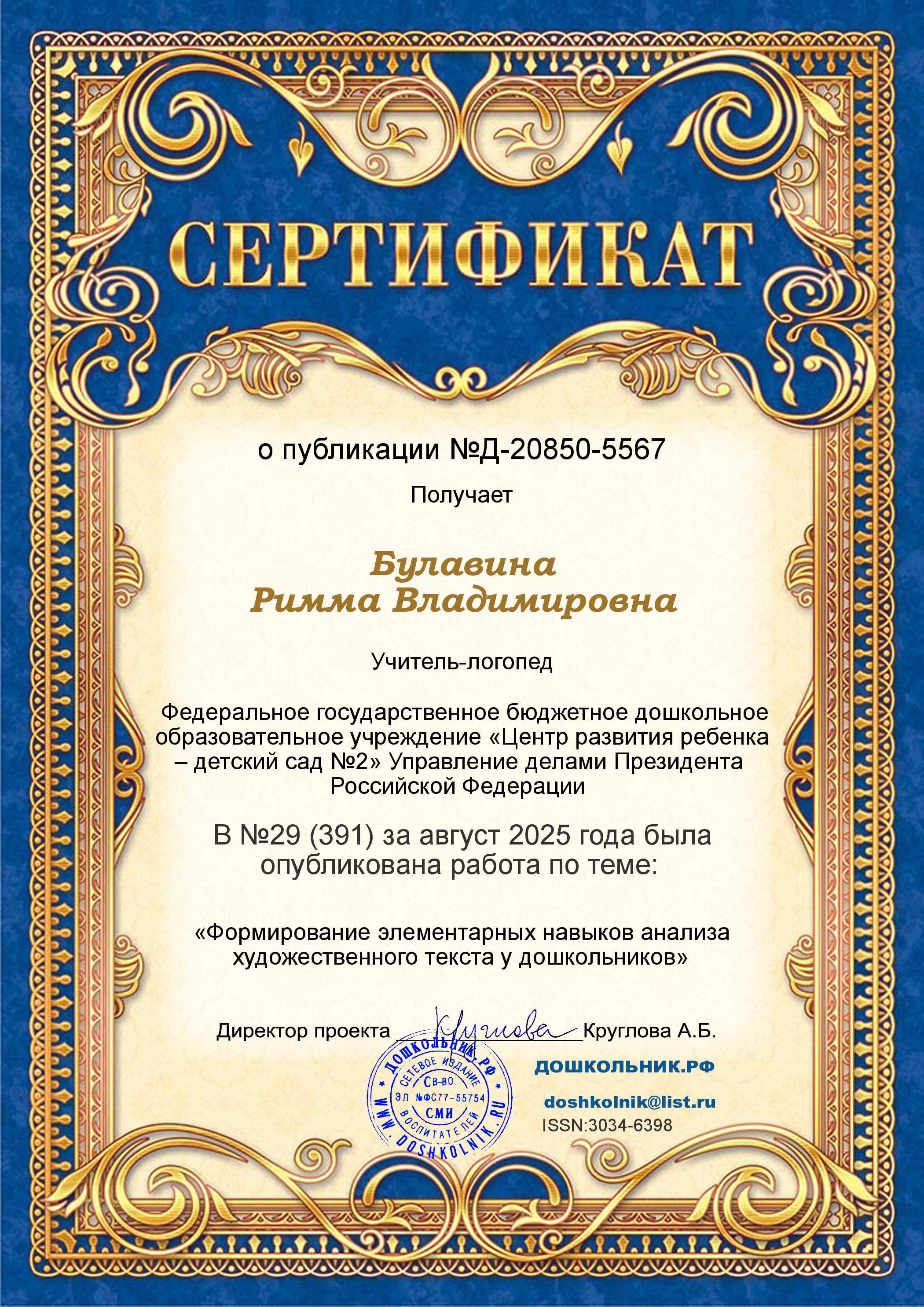 Сертификат о публикации в журнале "Дошкольник" №29 (391) за август 2025г. работы по теме: "Формирование элементарных навыков анализа художественного текста у дошкольников"