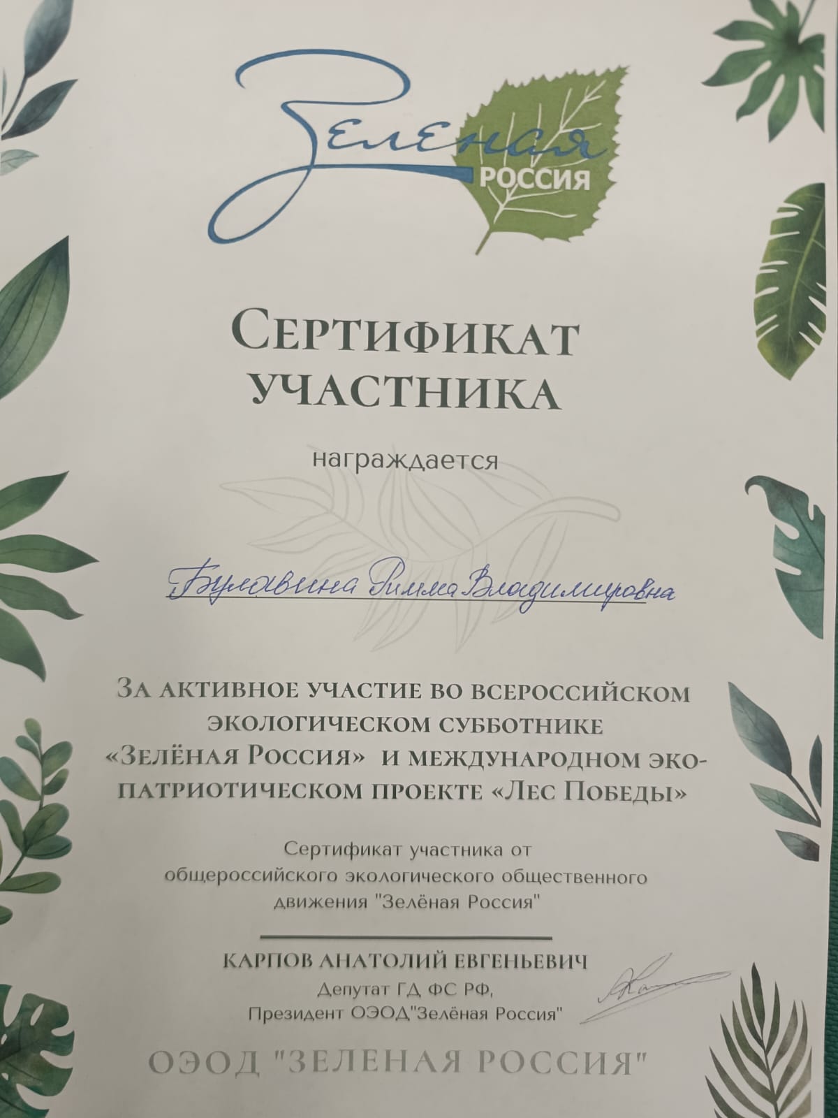 Сертификат участника всероссийского экологического субботника "Зелёная Россия" и международного эко-патриотического проекта "Лес Победы"