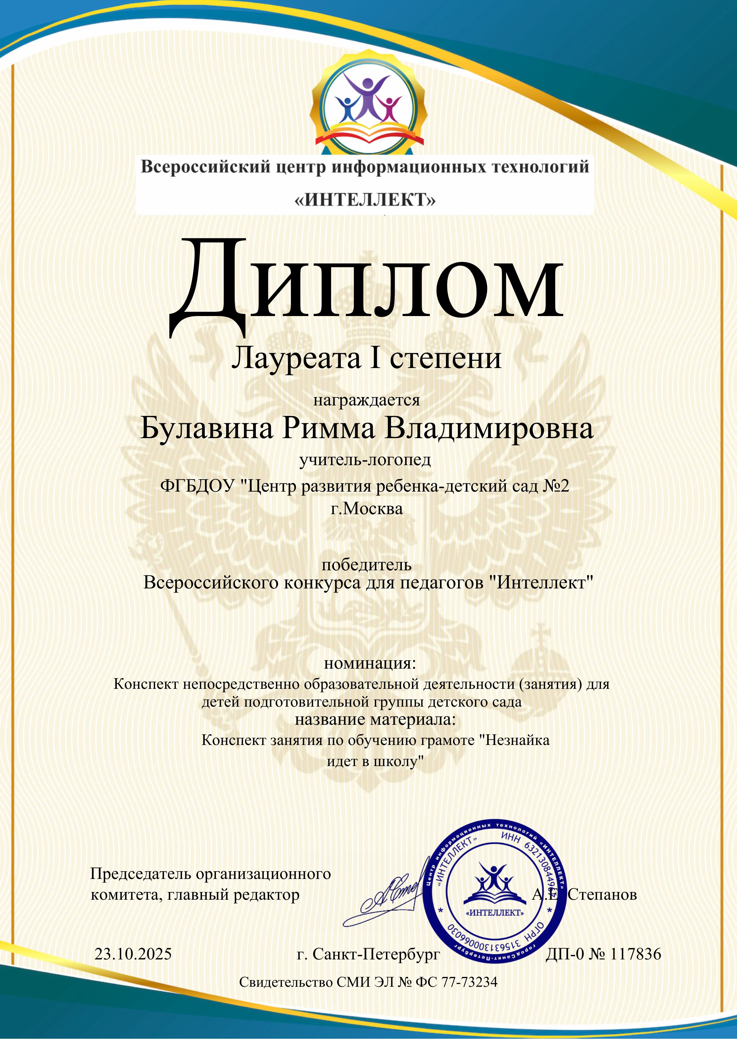 Диплом лауреата 1 степени всероссийского конкурса для педагогов "Интеллект", победитель в номинации: конспект НОД по обучению грамоте "Незнайка идет в школу" 23.10.2025