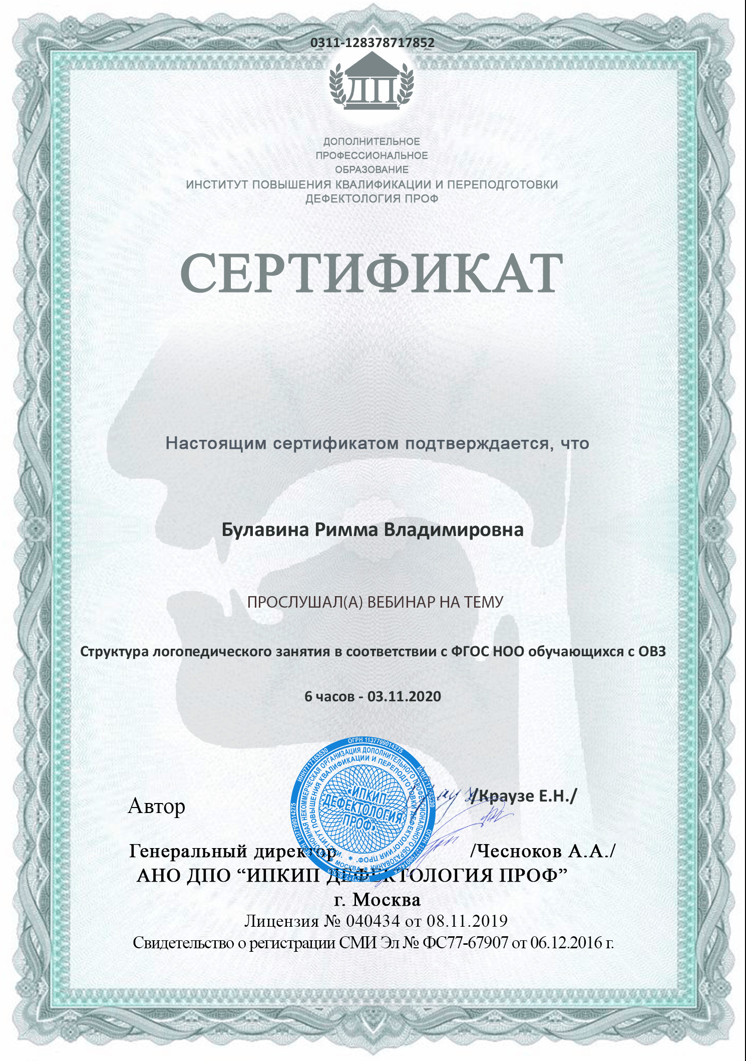 Сертификат участника вебинара на тему:"Структура логопедического занятия в соответствии с ФГОС НОО обучающихся с ОВЗ" (6 часов) 03.11.2020.