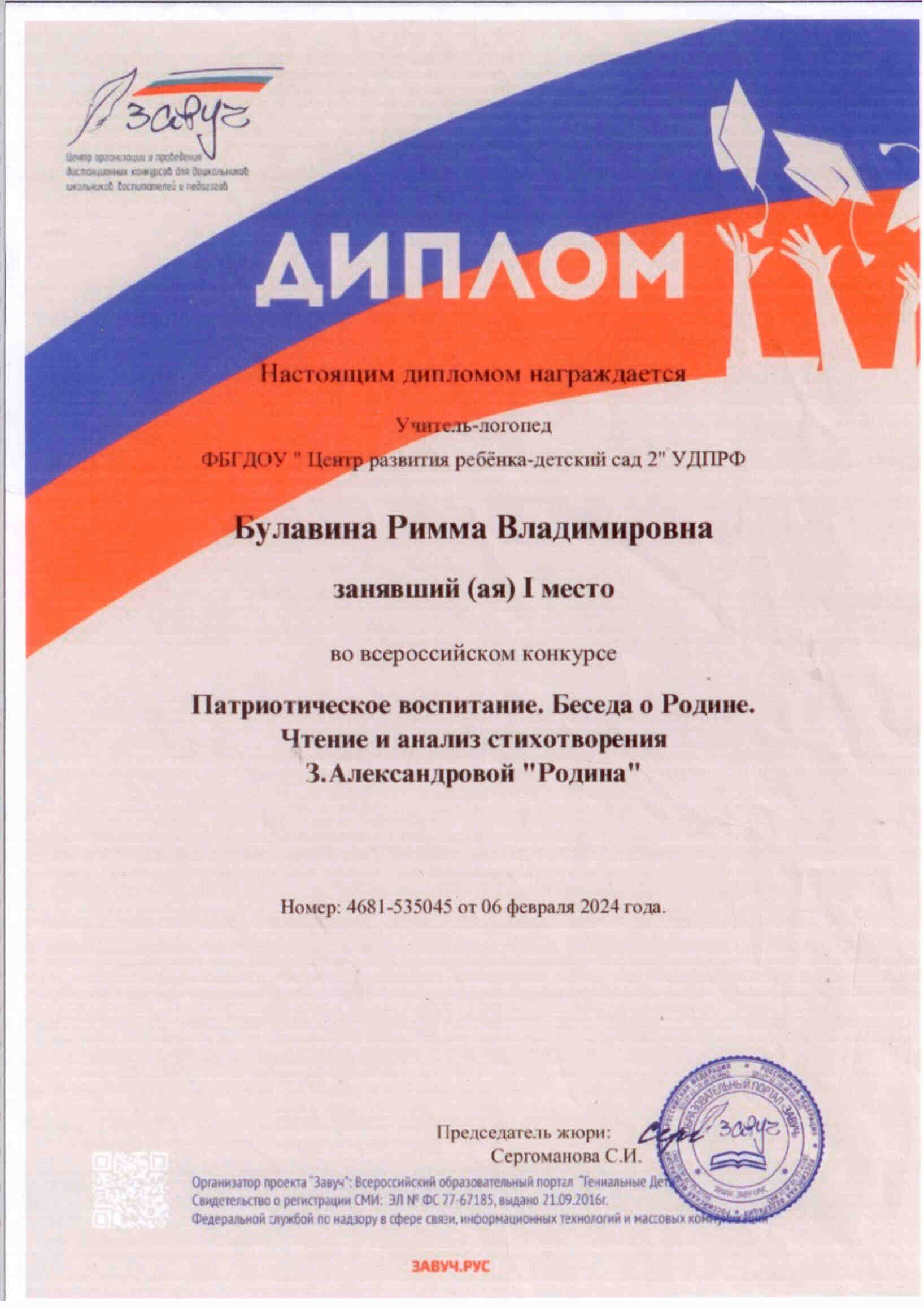 Диплом победителя всероссийского конкурса "Патриотическое воспитание" Работа: Беседа о Родине. Чтение и анализ стихотворения З.Александровой "Родина". 06.02.2024г.