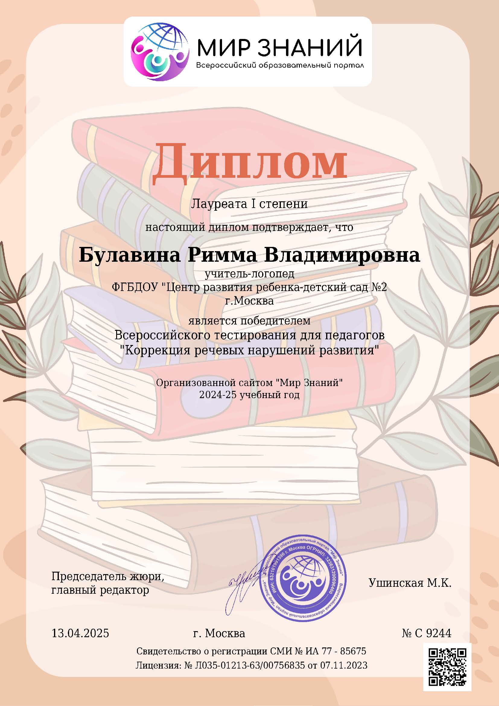 Диплом лауреата I степени Победитель Всероссийского тестирования для педагогов "Коррекция речевых нарушений развития", Всероссийского образовательного портала "Мир знаний". 13.04.2025.