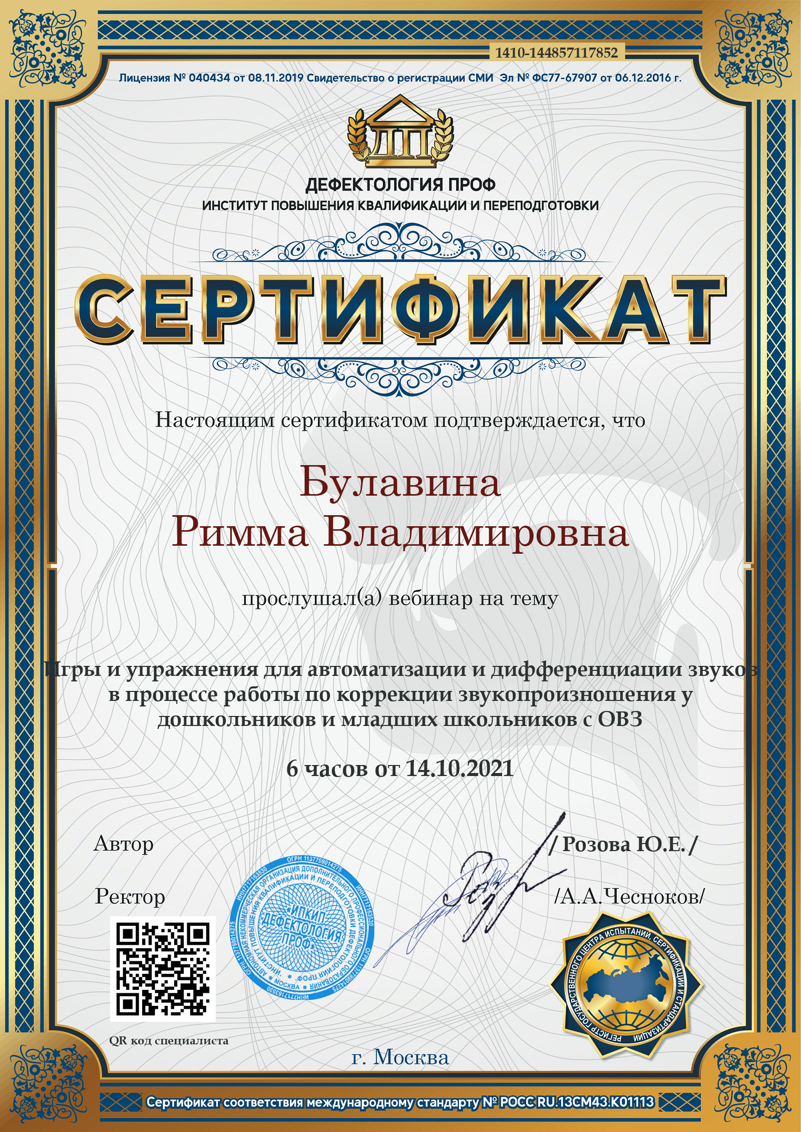 Сертификат участника вебинара на тему:"Игры и упражнения для автоматизации и дифференциации звуков в процессе работы по коррекции дошкольников и младших школьников с ОВЗ" (6часов) 14.10.2021.