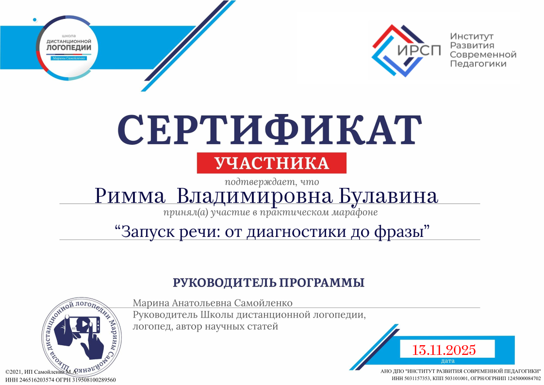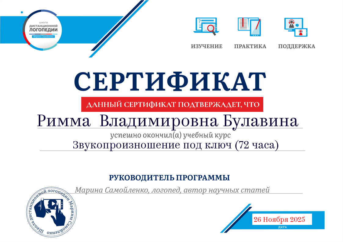 (Школа дистанционной логопедии. 72 часовчасов. Форма обучения: заочная. Направленность: методика преподавания предмета).