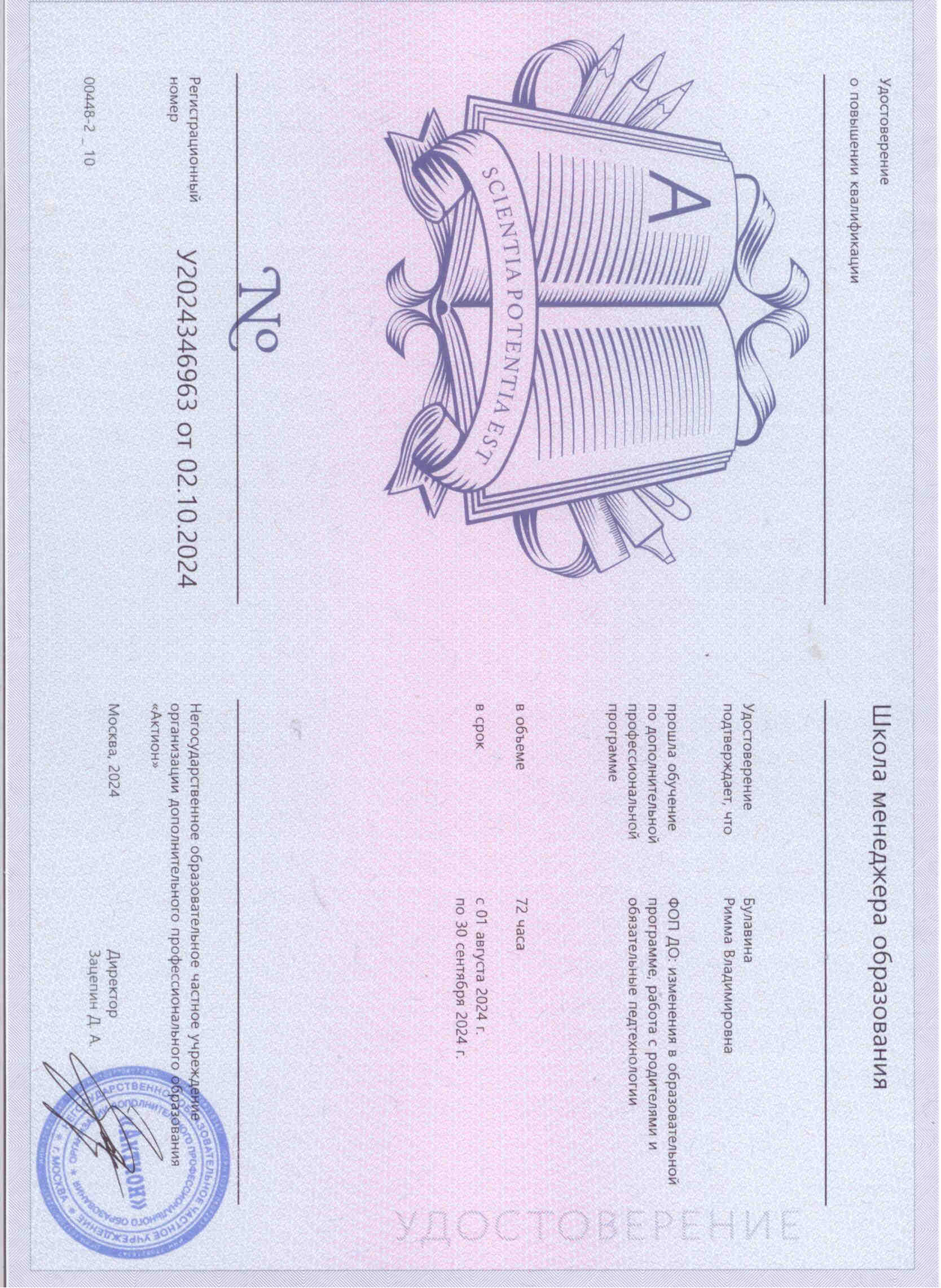 (Организация дополнительного профессионального образования "Актион". 72 часачасов. Форма обучения: Заочная. Направленность: иное).